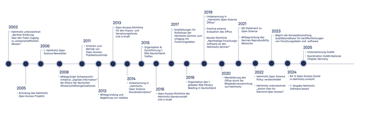 Im Jahr 2005 nahm diese Vision mit dem Start des Helmholtz Open Access Project Gestalt an, das von Hans Pfeiffenberger (Alfred-Wegener-Institut, Helmholtz-Zentrum für Polar- und Meeresforschung) und Roland Bertelmann (GFZ Helmholtz-Zentrum für Geowissenschaften) geleitet wurde. In seinem grundlegenden Strategiepapier „Implementing Open Access to Publications and Data from the Helmholtz Association” skizzierte das Projekt vier Schwerpunktbereiche: